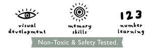 This set includes 24 sturdy cards featuring sweet animals like pandas, birds, and fish, paired with numbers 1 through 12. Made with thick FSC-certified board and printed with eco-friendly ink, they’re safe for babies to explore and durable enough for years of hands-on learning. A helpful guide card offers ideas for memory games and other screen-free activities to enjoy as your child grows.