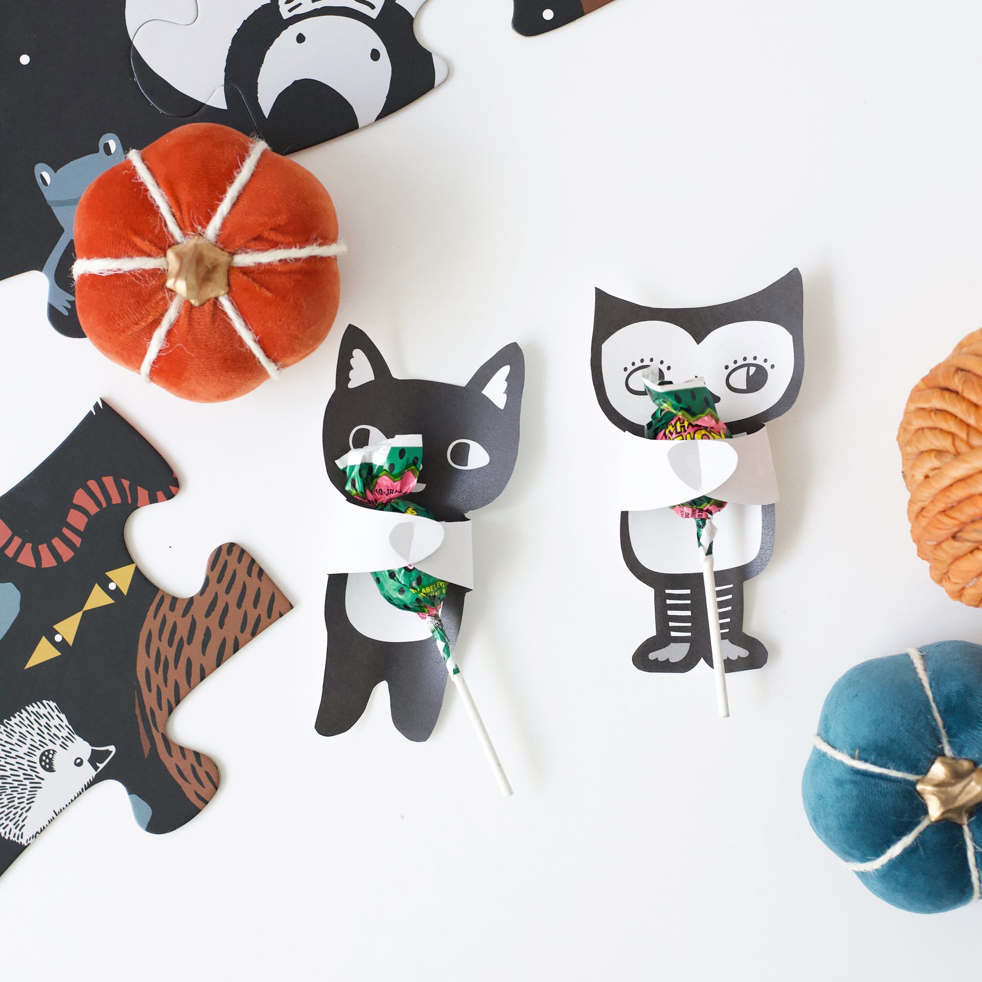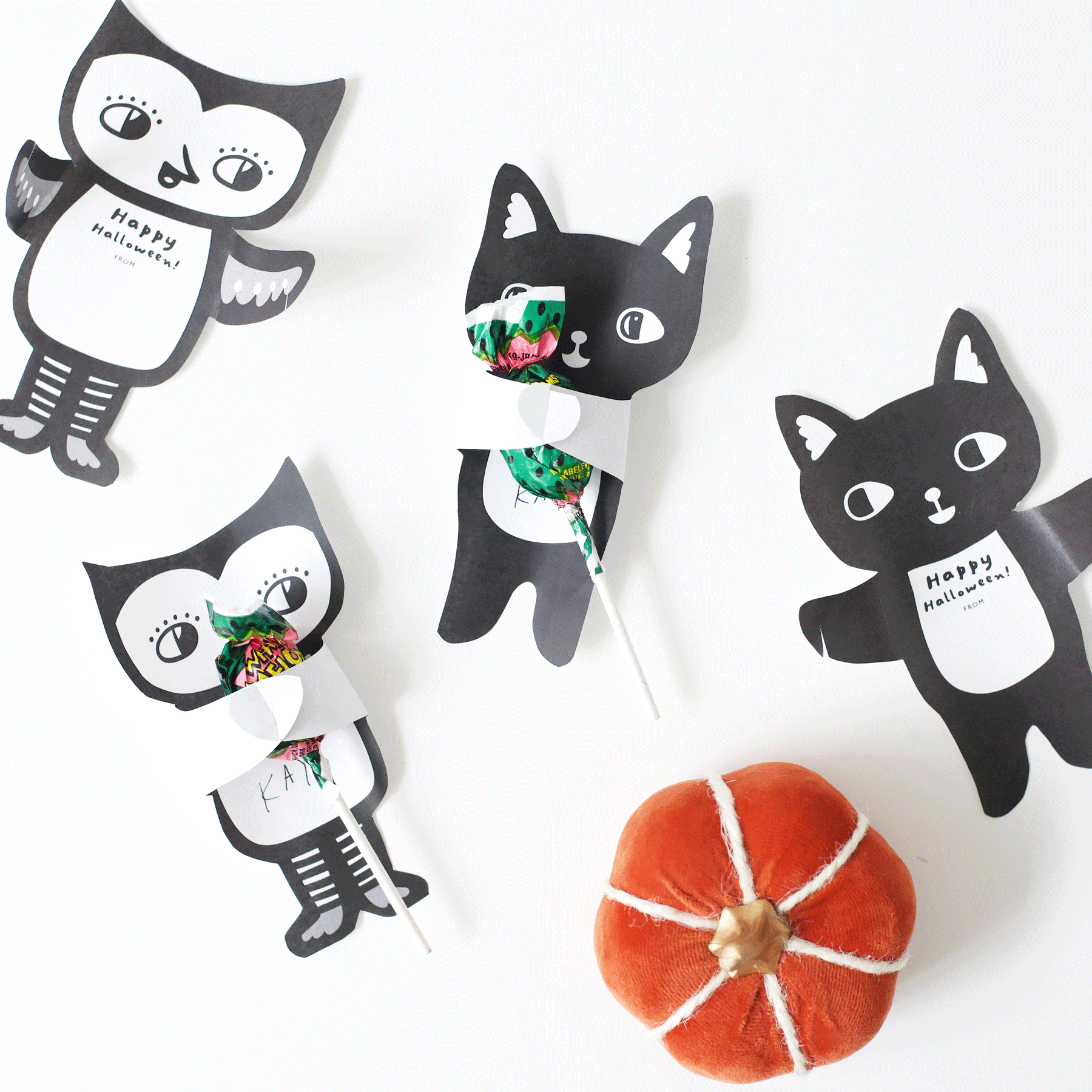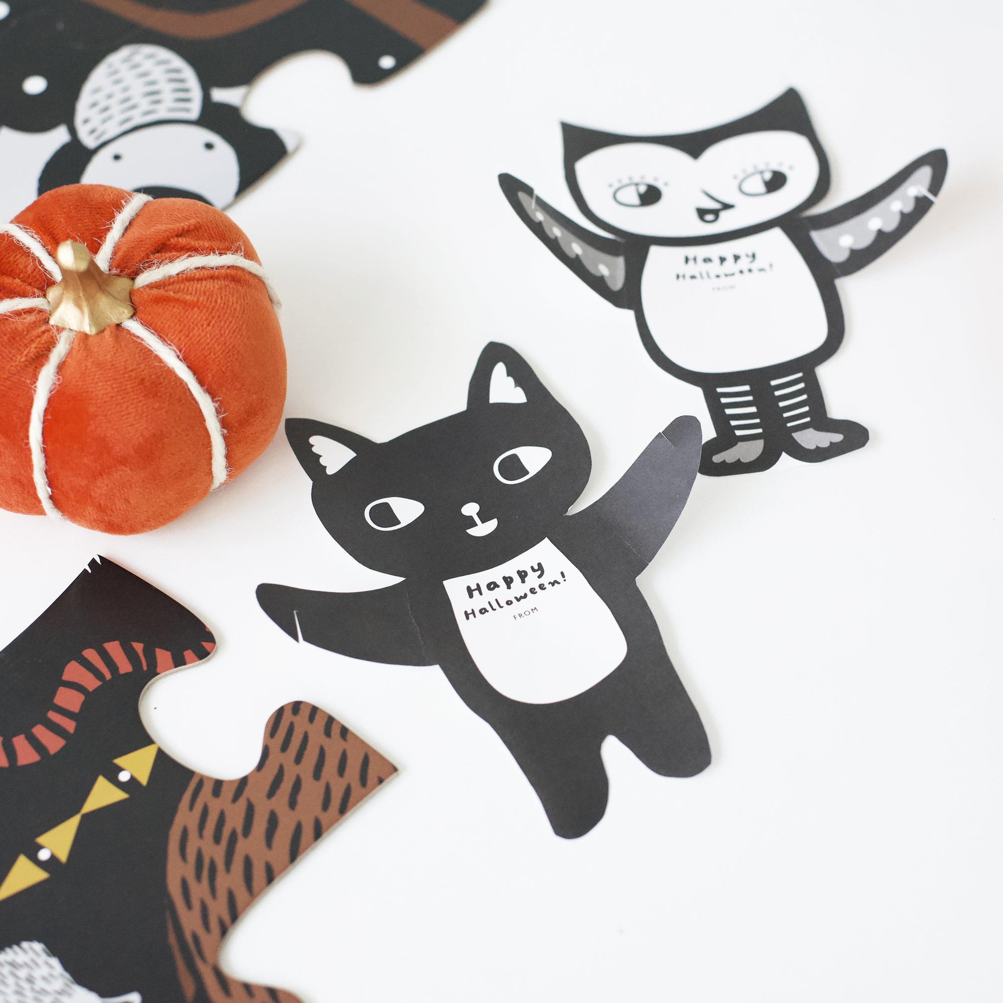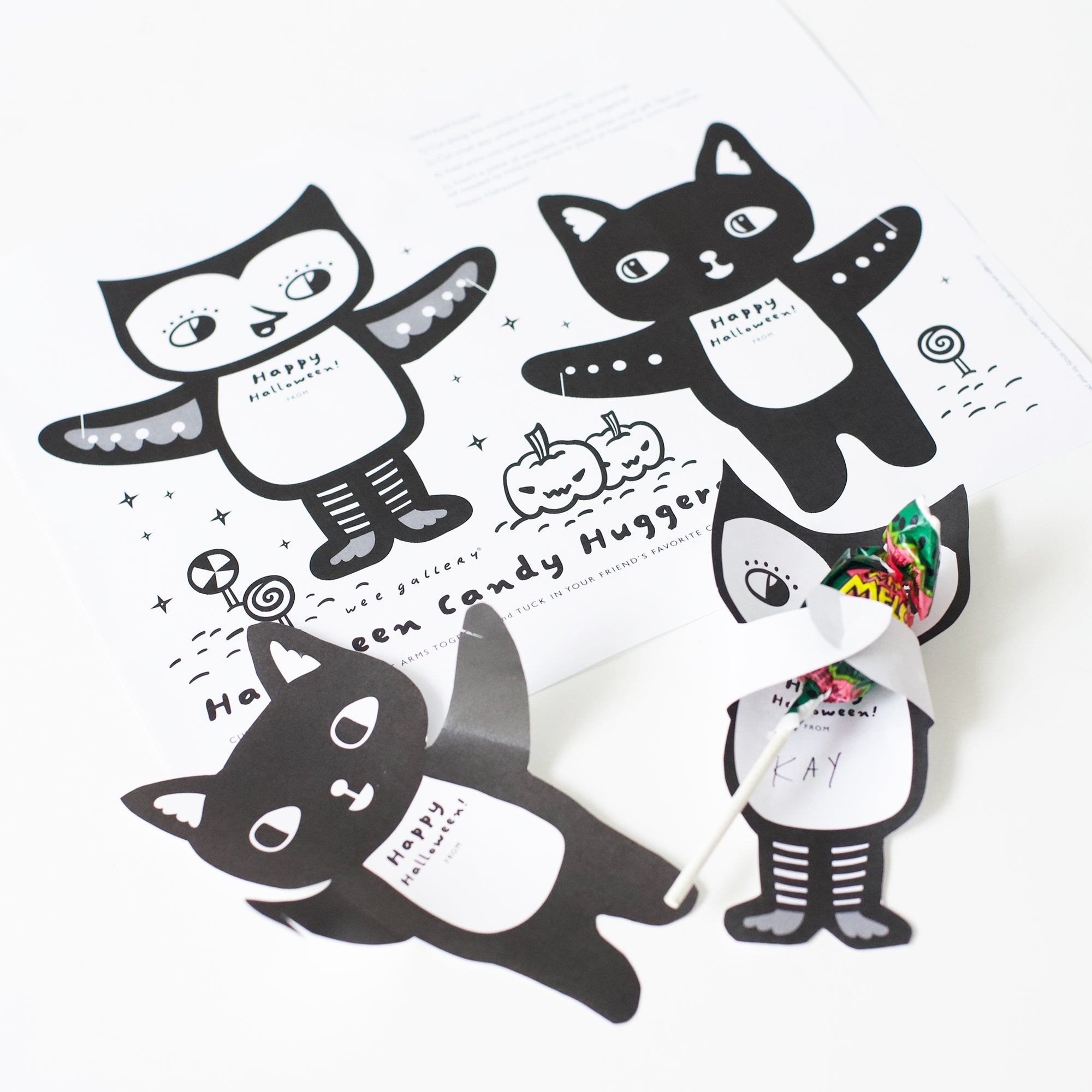 Machen Sie Ihr Halloween bezaubernd und lustig mit diesen Candy Huggers mit Katze und Eule! Kinder können diese Halloween-Freunde bei Bedarf ausmalen und individuell gestalten oder sie schwarz und weiß lassen, weil sie so oder so supersüß sind. Schneiden Sie einfach die Formen aus und schneiden Sie die kleinen Schlitze dort ein, wo sich die Linien auf den Armen/Flügeln befinden. Hier passen sie zusammen und „umarmen“ die Süßigkeiten oder Leckereien, die Sie teilen möchten.