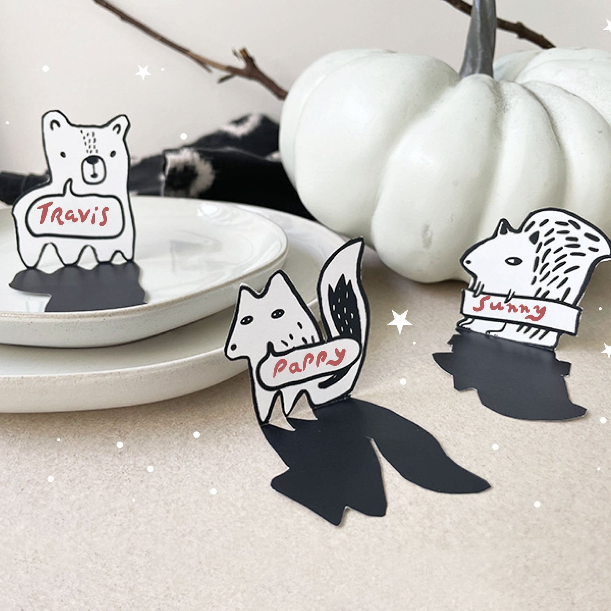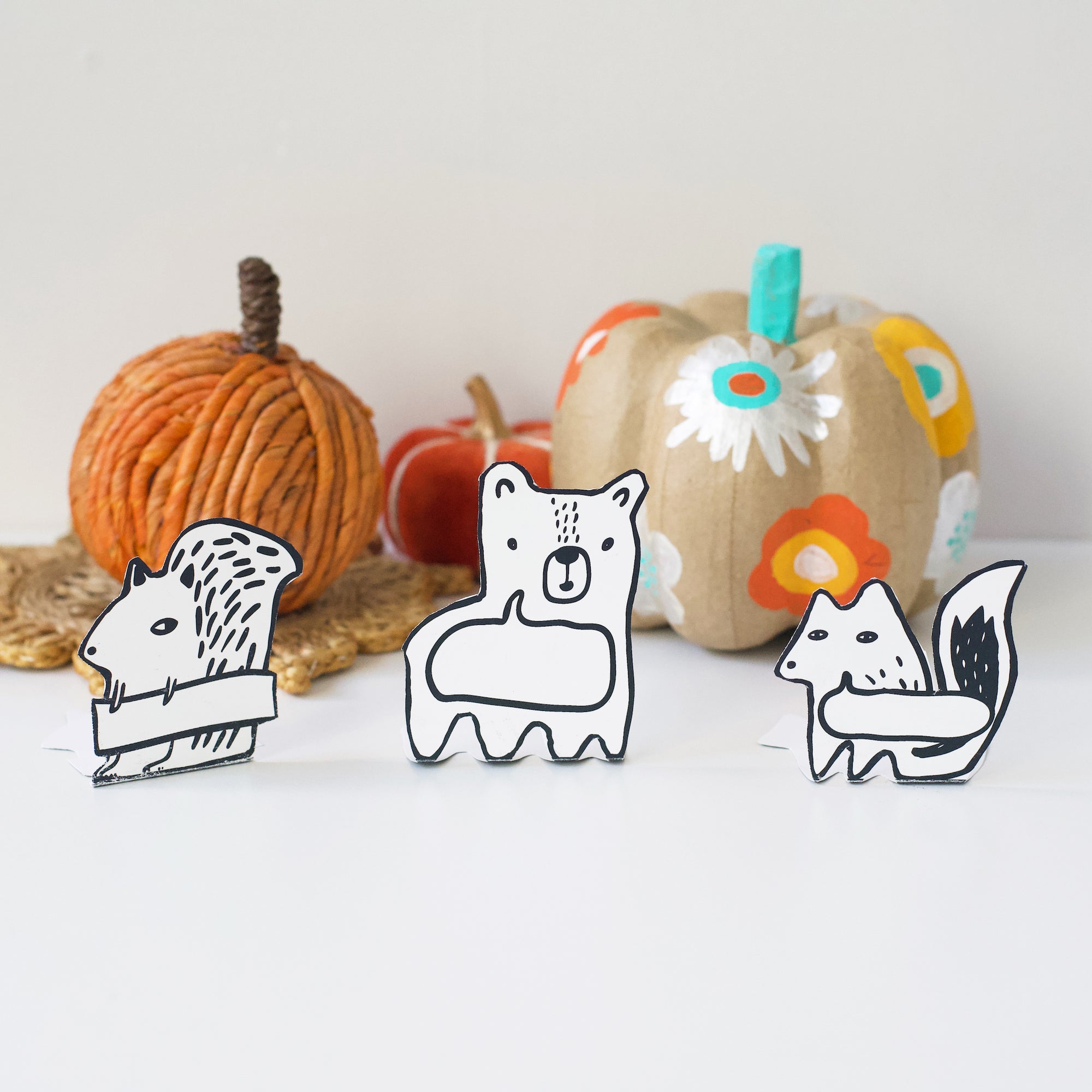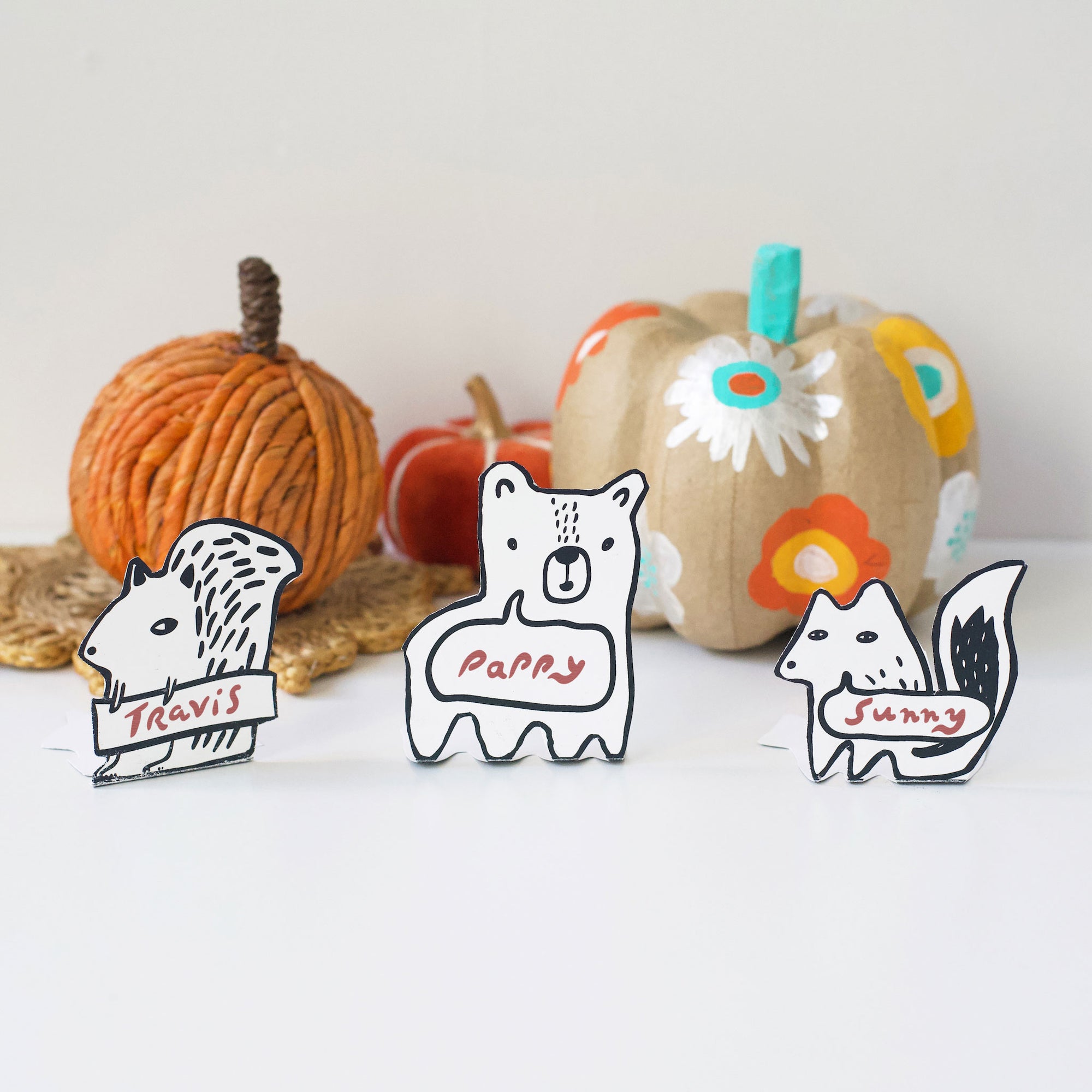 The holidays are upon us, which means time for festive gatherings and shared meals. Lucky for you, squirrel, fox, and bear have come to greet your guests! Color and decorate these dinner place cards as you wish, and add the name of friends and family who have come to enjoy Thanksgiving, Friendsgiving, or the feast or party that inspires you.