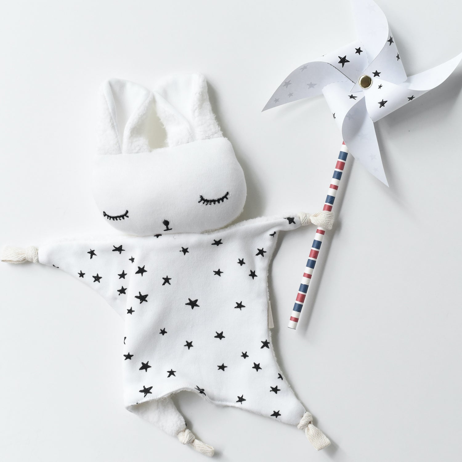 Cotton soft Cuddle Bunny posed holding a star themed paper pinwheel.