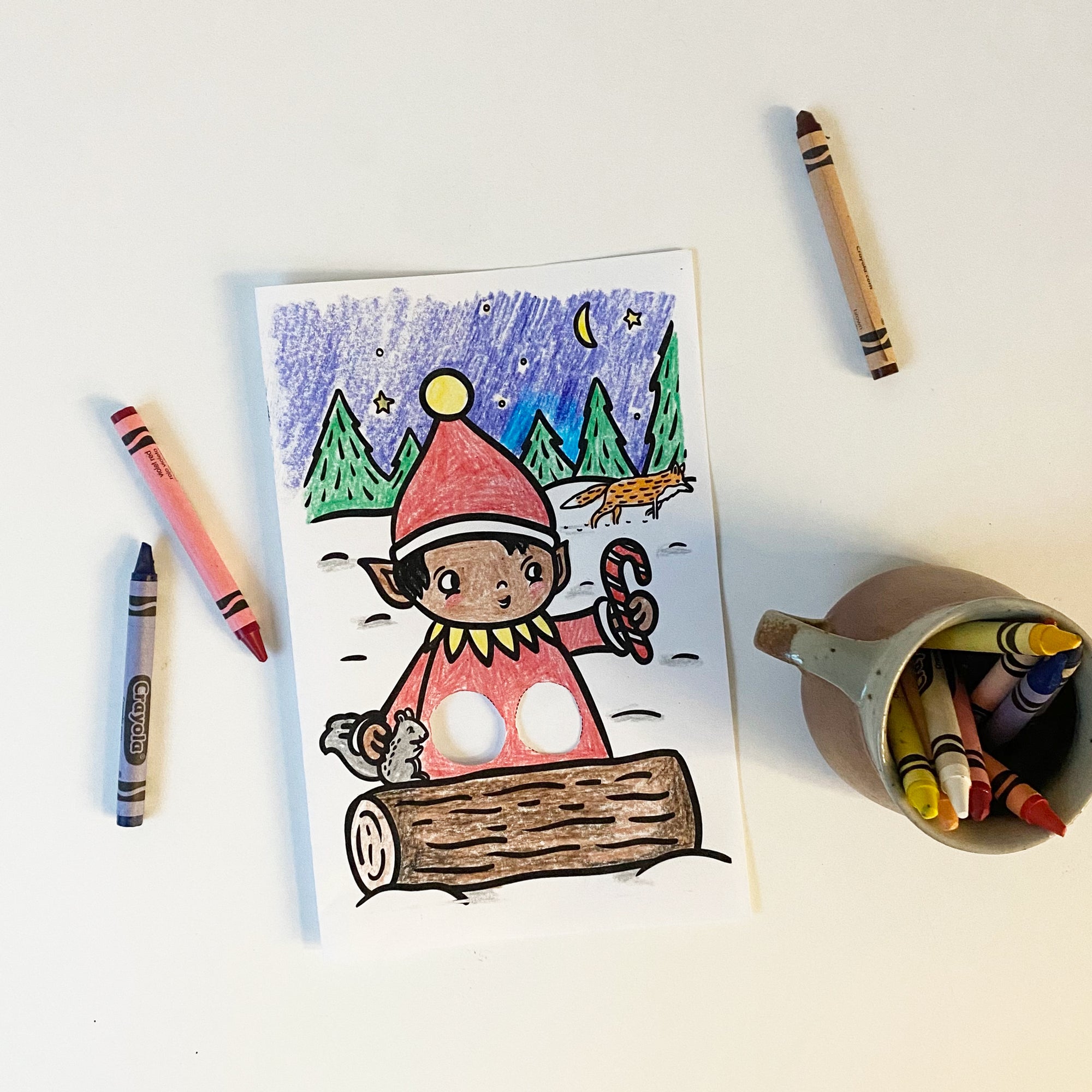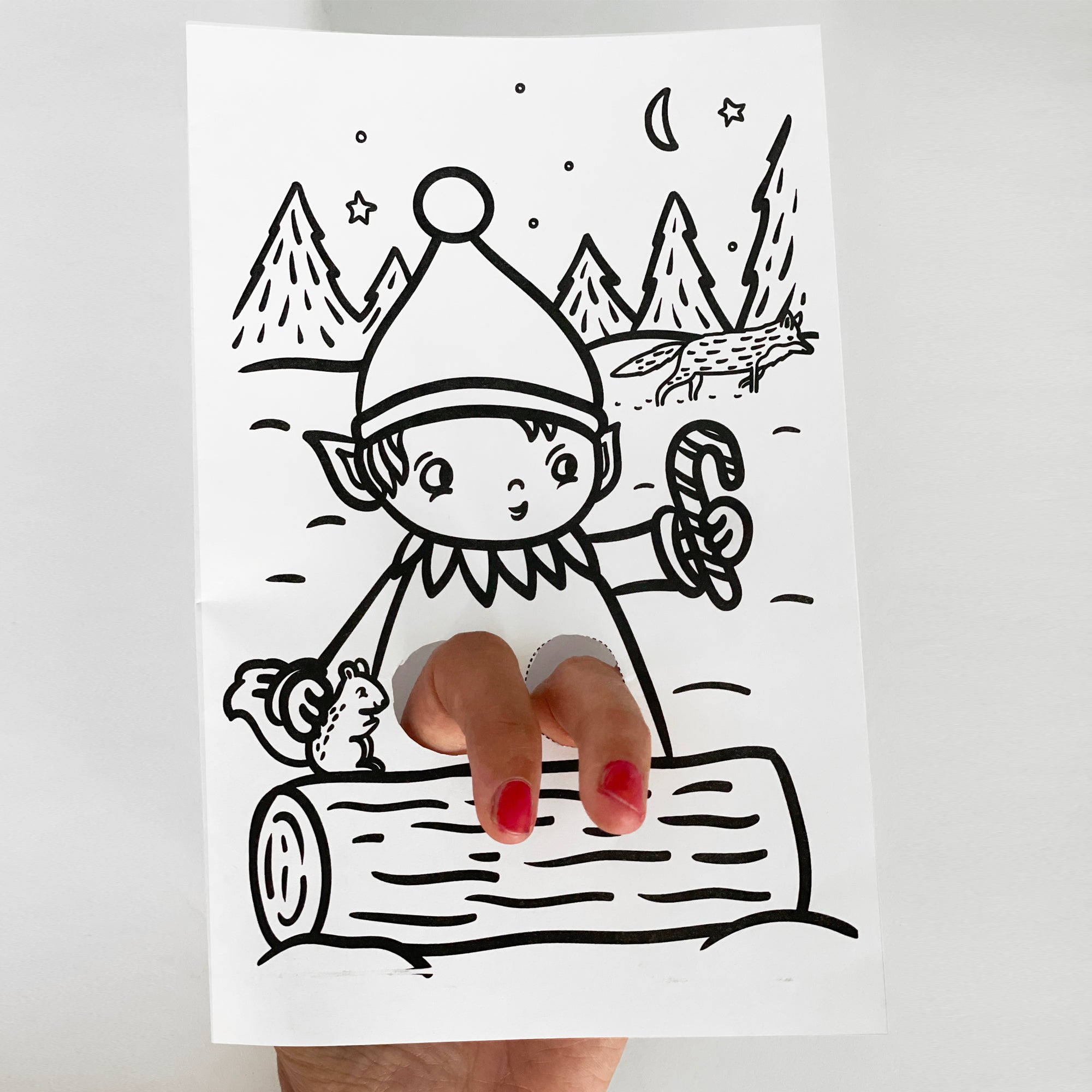 Une carte Elfe festive très mignonne pour vous ! Une touche d'esprit de vacances et d'amusement, les parents et les enfants peuvent colorier et jouer avec cette carte en utilisant vos doigts pour créer les jambes agitées du sympathique elfe. Joyeux noël!
