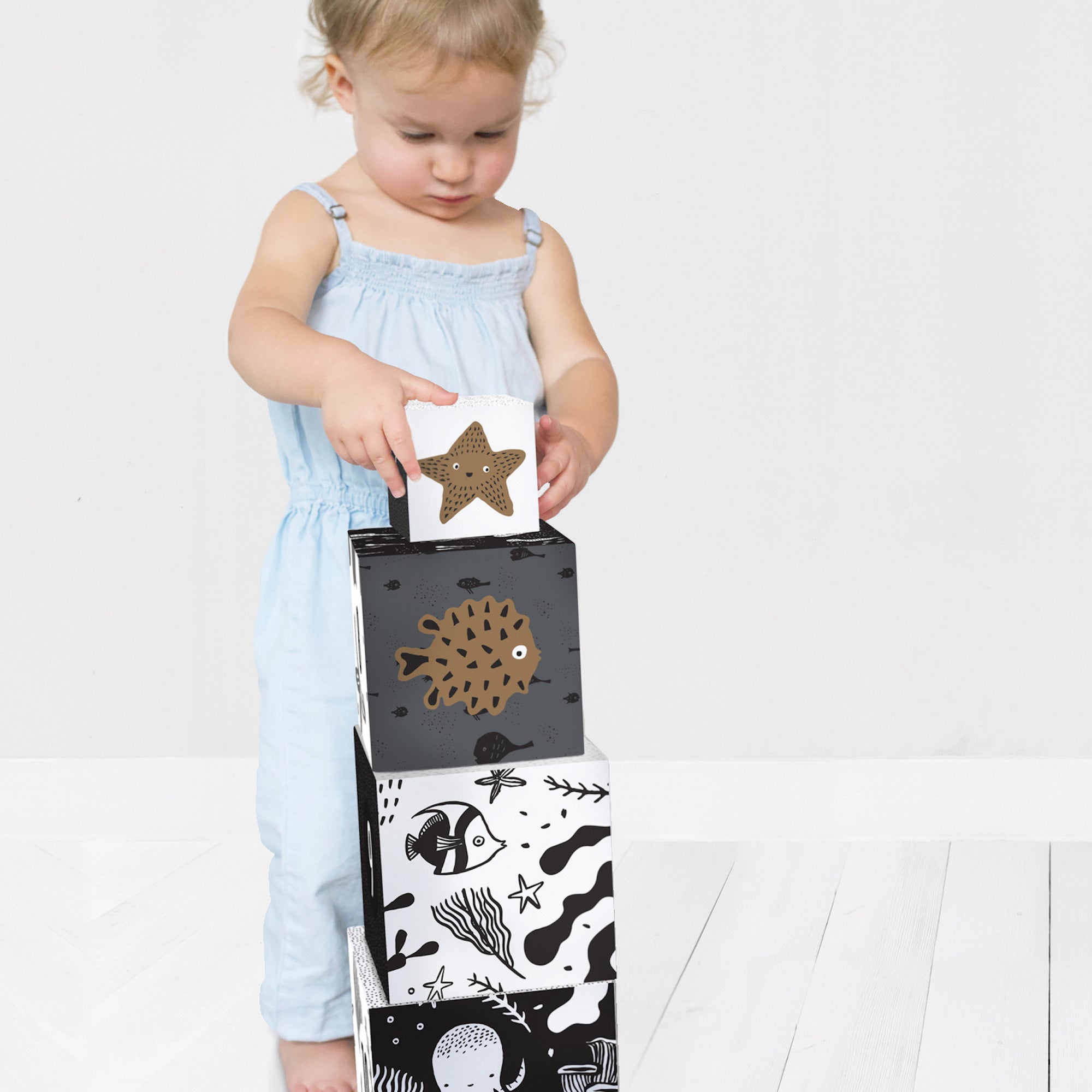 Les blocs gigognes Ocean Animals présentent des illustrations très contrastées de créatures et de motifs marins, ainsi que des chiffres de 1 à 10 qui correspondent à la taille du bloc. Ils peuvent être empilés jusqu'à 36 pouces de hauteur, une excellente activité de résolution de problèmes et de motricité pour l'explorateur chevronné. Une fois le jeu terminé, les blocs peuvent être emboîtés (pour un autre défi) et faciles à ranger.